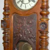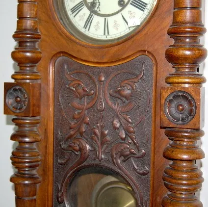 Muller & Co. Dolphin Carved German Wall Clock multi color porcelain dial; T & S; lower door panel has carved dolphins and foliage, brass trim and pendulum. Not tested. (Minor roughness; lower front edge needs stained; no top.) 39"
