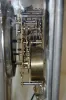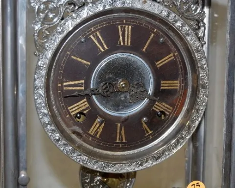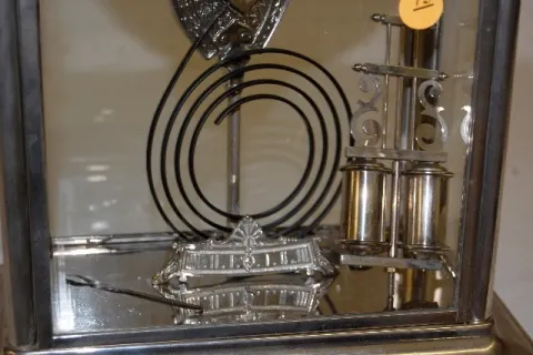 with a 5 1/2" black dial and gong strike; in a nickel case. (Not running.) 17 1/8"...