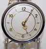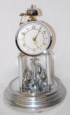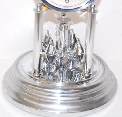 Roma, Germany 400 Day Bell Strike Dome Clock marked Germany silver metal dial; rotating pendulum; bell strike top; brass movement marked ROMA Made in Germany; chrome finish. Running. (Light finish wear; minute chips to rim of base.)12"