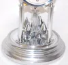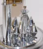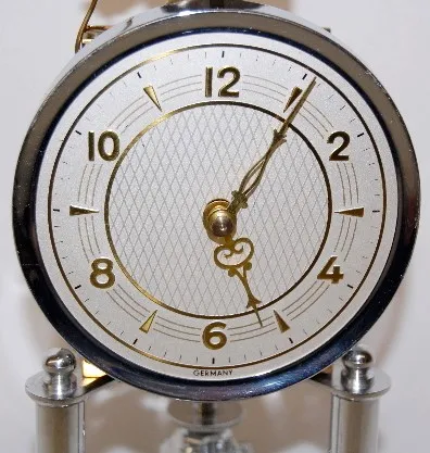 marked Germany silver metal dial; rotating pendulum; bell strike top; brass movement marked ROMA Made in Germany; chrome finish. Running. (Light finish wear; minute chips to rim of base.)12"