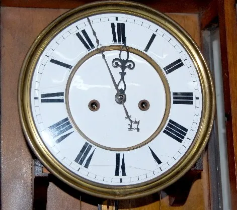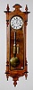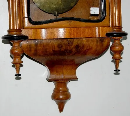 2 Wt. Vienna Regulator Clock unsigned; has 2 weights and pendulum with crank style key; porcelain with chapter ring; carved wood with ebonized trim case. (Hairlines on chapter ring; brass bezel has a few dents at the 6; lower finial point is missing.) Not tested. 44"