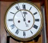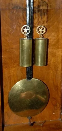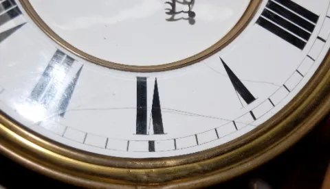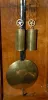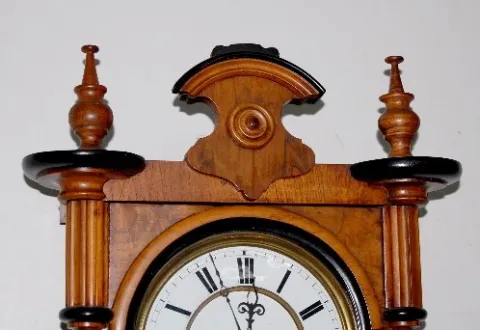 unsigned; has 2 weights and pendulum with crank style key; porcelain with chapter ring; carved wood with ebonized trim case. (Hairlines on chapter ring; brass bezel has a few dents at the 6; lower finial point is missing.) Not tested. 44"