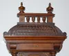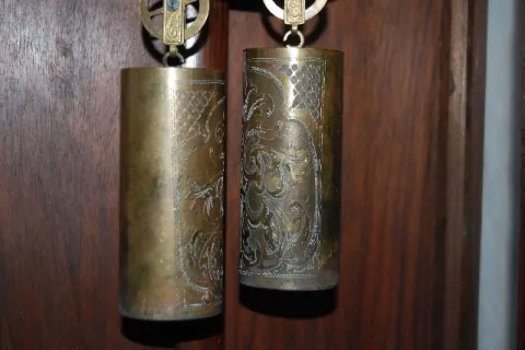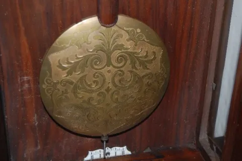 With Decorated Features: 7" metal chapter ring with embossed center; the weights and pendulum all having matching engraving; in a carved turned wood case with brass decoration. (Bad weight suspension line.) Not tested. 51 1/2"