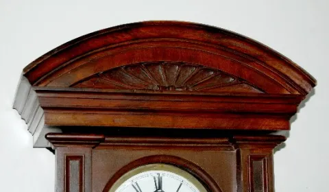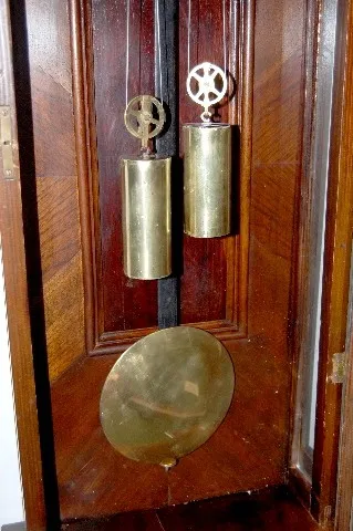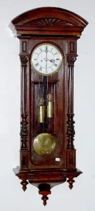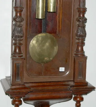 2 Wt Vienna; carved case. porcelain dial; with weights and oendulum. (Clock has been restored.) 46"