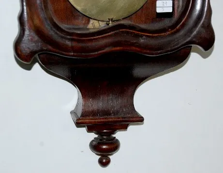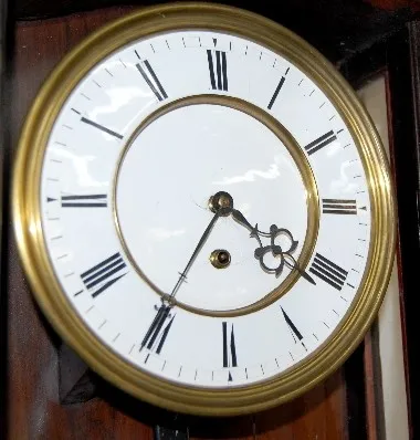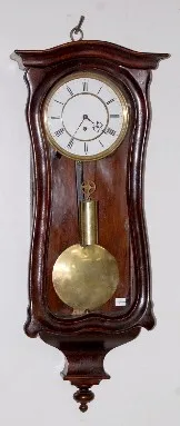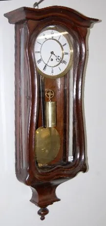1 Wt. Serpentine Vienna Regulator Clock not signed; porcelain dial; TO; 1 weight and pendulum. (Dial has minor damage; small dents in pendulum and weight.) 31"
