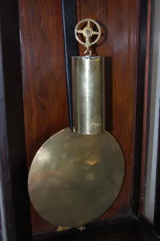 not signed; porcelain dial; TO; 1 weight and pendulum. (Dial has minor damage; small dents in pendulum and weight.) 31"