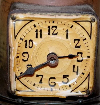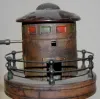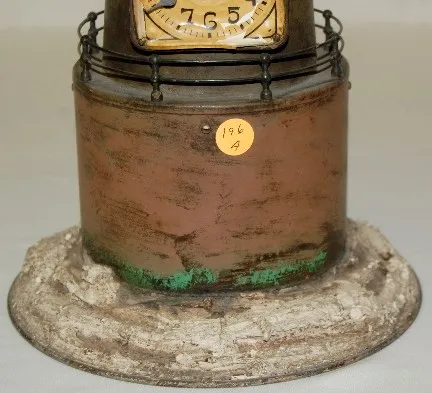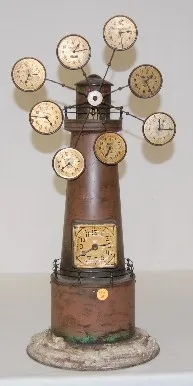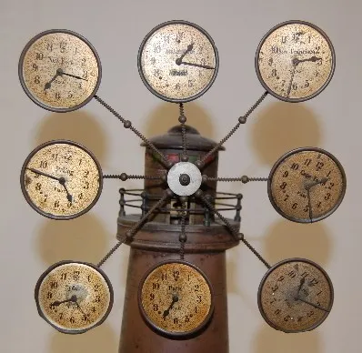 9 Time Zone Lighthouse Clock metal body with applied plaster on the base to simulate brass. Not tested. (Clock dial is rough; expected roughness to case.) 23"