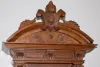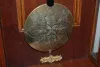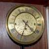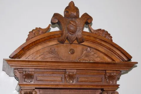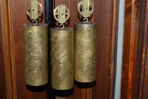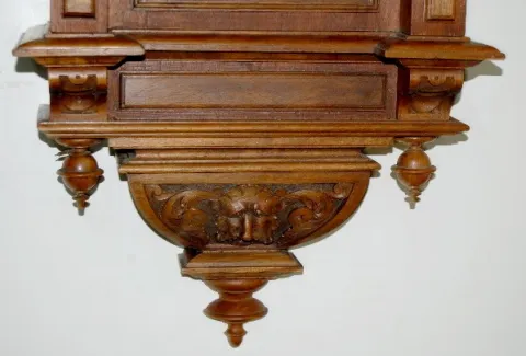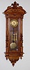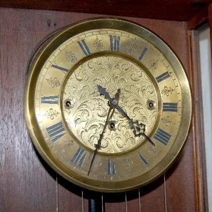 ornate carved walnut case with carved face mask ; heavily engraved brass dial, weights and pendulum. Not tested. 56"