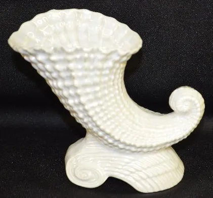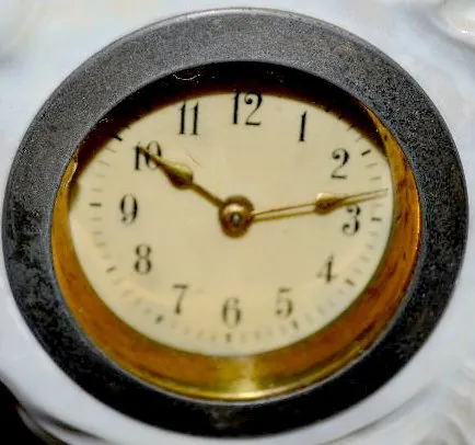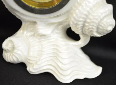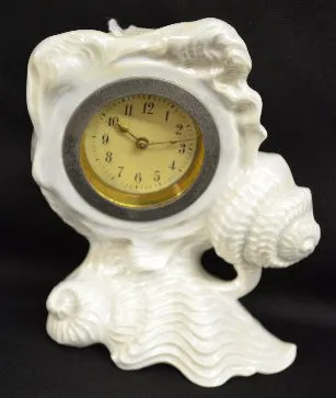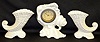 3 Piece Clock Set, Lustre Finish w/Shells It is unmarked and has a celluloid dial and a fixed winder. The side pieces are in the form of cornucopias. The clock is running at this time. 6" Tall