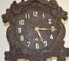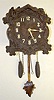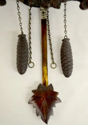It has a pressed wood front with birds and flowers on it. The movement is unmarked. The key, leaf pendulum and 2 pine cone weights are with the clock....