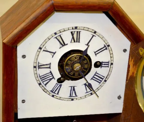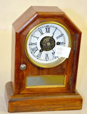 Rosewood Octagon Top Mini Mantel Clock There is an 8 day T&S with alarm movement and has a painted tin dial. There is a mirror on the bottom portion of the door. The pendulum and key are with it. The clock is running at this time. (The dial has been repainted.) 9 1/2" Tall