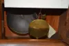 There is an 8 day T&S with alarm movement and has a painted tin dial. There is a mirror on the bottom portion of the door. The pendulum and key are with it. The clock is running at this time. (The dial has been repainted.) 9 1/2" Tall