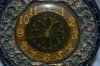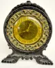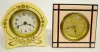 1.) Lux Novelty Clock - pink tile shaped with an E Foxco - NY City sticker on the back. The clock is running at this time. 3 5/8" x 3 5/8". 2.) Lux Novelty Clock - with a plastic/celluloid front with gold and floral ribbon designs. (Not running at this time.) 4" Tall x 3 5/8" Wide 3.) Free Standing Sirocco Wood Clock with a chapter ring with raised and painted numbers. The decorated band around the chapter ring has Fleur-di-Lis and acanthus leaves on it. The brass case over the movement is marked Pat's Pending. There is no maker's information to be found. The clock is running at this time. Dial - 2 3/4" Diameter; Case - 6 3/8" Tall x 5 1/8" Wide