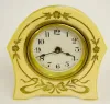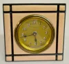 3 Art Deco Miniature Clocks, Lux & Sirocco 1.) Lux Novelty Clock - pink tile shaped with an E Foxco - NY City sticker on the back. The clock is running at this time. 3 5/8" x 3 5/8". 2.) Lux Novelty Clock - with a plastic/celluloid front with gold and floral ribbon designs. (Not running at this time.) 4" Tall x 3 5/8" Wide 3.) Free Standing Sirocco Wood Clock with a chapter ring with raised and painted numbers. The decorated band around the chapter ring has Fleur-di-Lis and acanthus leaves on it. The brass case over the movement is marked Pat's Pending. There is no maker's information to be found. The clock is running at this time. Dial - 2 3/4" Diameter; Case - 6 3/8" Tall x 5 1/8" Wide