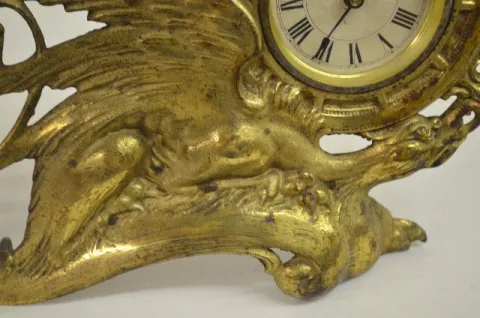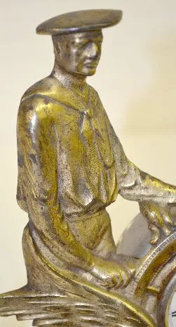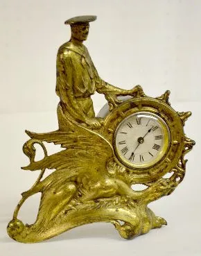 2 Cast Metal Figural Novelty Clocks: 1.) With set key wind and a porcelain dial. In a cast metal case formed as a griffin, ships wheel and captain. Th...