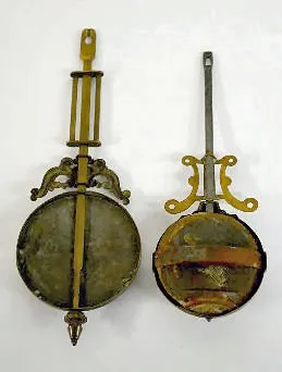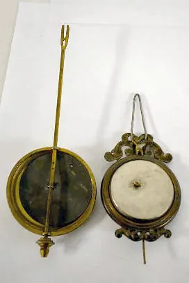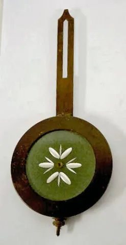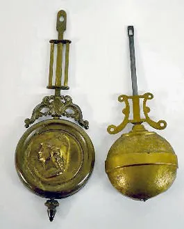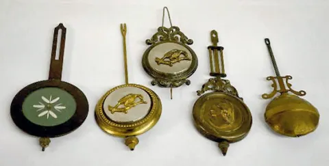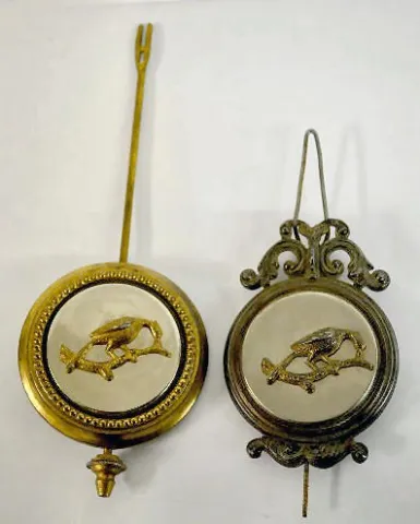 5 Decorative Antique Clock Pendulums There are 2 with birds; 1 with an embossed Mercury head; 1 ball shaped and 1 with a glass insert. All are in as found used condition. (The ball shaped pendulum needs to be soldered.) Longest 7 3/4" Long