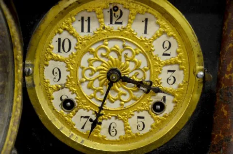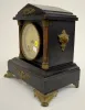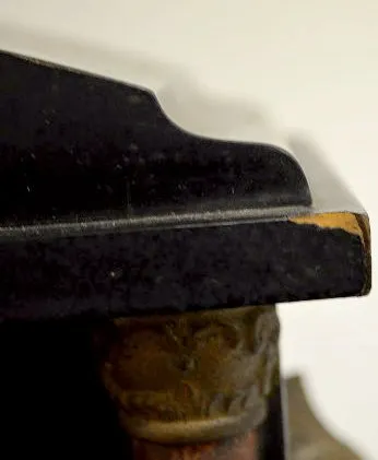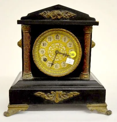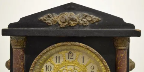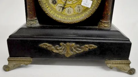 Enameled Oak Column Mantel Clock With a T&S movement; an unmarked dial; and the pendulum. The case has 2 faux red marbleized columns plus metal trim and decoration. Not tested. 12 3/4" Tall