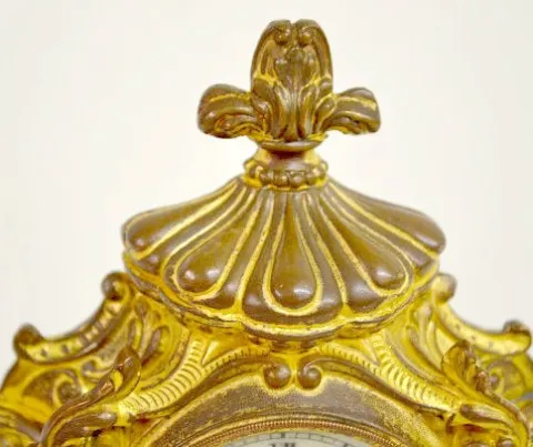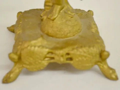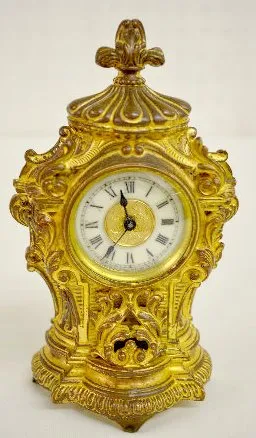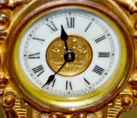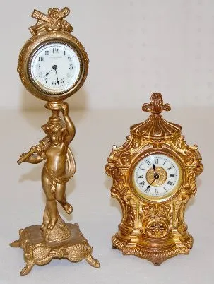 1.) New Haven Figural Novelty Clock: A classical youth with a scepter supports the clock on his head. In a painted gold spelter case. Dial - 2" Diamet...