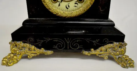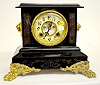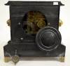 Enameled Iron Case Mantel Clock With a T&S movement; an unmarked porcelain dial with visible escapement; lion head side ornaments and paw feet with three toes. Not tested. (There is no pendulum or key with the clock.) 11 1/2" Tall