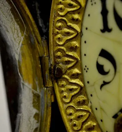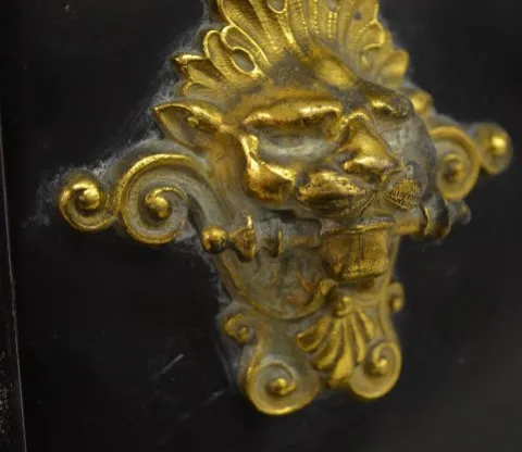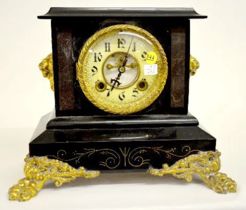 With a T&S movement; an unmarked porcelain dial with visible escapement; lion head side ornaments and paw feet with three toes. Not tested. (There is no pendulum or key with the clock.) 11 1/2" Tall