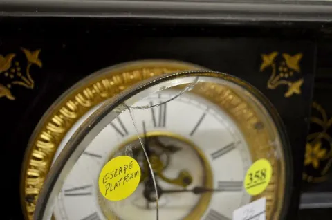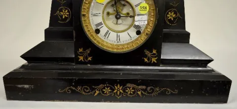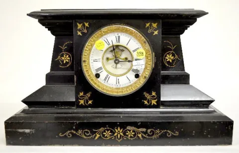 Enameled Iron Case Mantel Clock With a T&S movement; an unmarked porcelain dial with visible escapement; and in a case with gold floral and ivy leaf decorations. (The clock is wound tight and not running at this time.) (There is no pendulum or key with the clock. The glass door is screwed on so we did not open it. The movement appears to be attached to a board inside the clock. The glass in the door is damaged. There are rubs to the front of the case.) 10 3/4" Tall