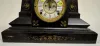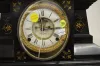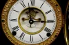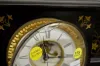 With a T&S movement; an unmarked porcelain dial with visible escapement; and in a case with gold floral and ivy leaf decorations. (The clock is wound tight and not running at this time.) (There is no pendulum or key with the clock. The glass door is screwed on so we did not open it. The movement appears to be attached to a board inside the clock. The glass in the door is damaged. There are rubs to the front of the case.) 10 3/4" Tall