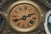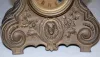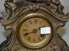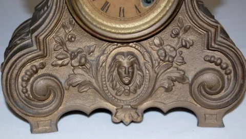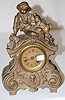 The maker is unknown; with a paper dial. There is one key slot; the pendulum is built into the movement. The white metal case has a happy boy and a puppy on the top. Below the dial is the mask of a very sad looking woman. The clock winds OK. (The paper dial has darkened and is worn around the key slot. The clock will not run steadily.) 11 1/4" Tall