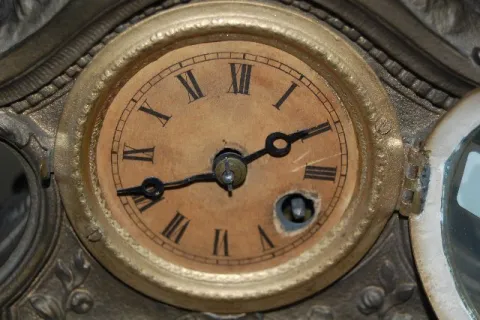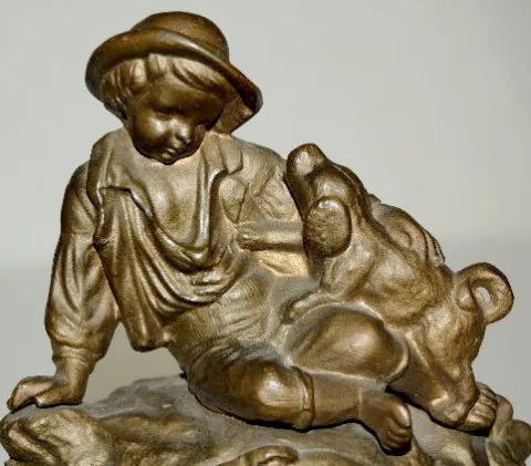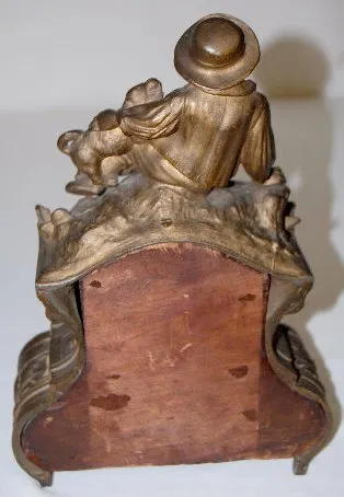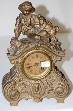 Antique White Metal Clock w/Boy & Dog The maker is unknown; with a paper dial. There is one key slot; the pendulum is built into the movement. The white metal case has a happy boy and a puppy on the top. Below the dial is the mask of a very sad looking woman. The clock winds OK. (The paper dial has darkened and is worn around the key slot. The clock will not run steadily.) 11 1/4" Tall