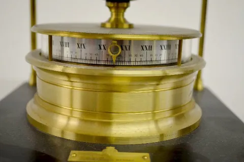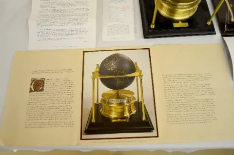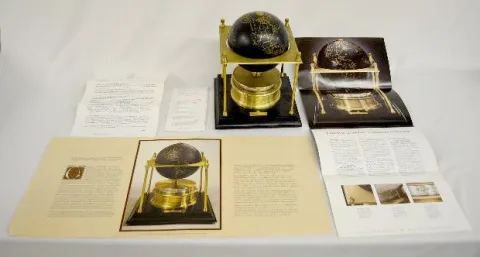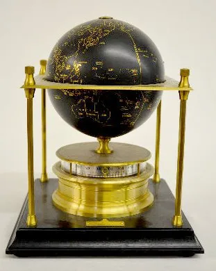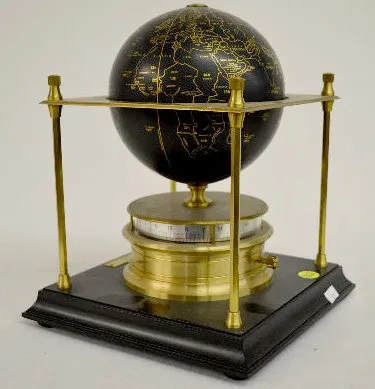 from England's prestigious Royal Geographical Society; brass and metal with wood base; 1979 on the presentation tag; annular style dial; has original paperwork in folder. 11 1/2" T x 9" Square base.