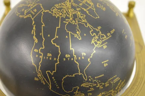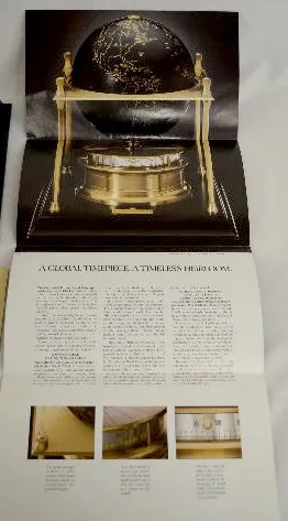 Royal Geographical Society World Clock from England's prestigious Royal Geographical Society; brass and metal with wood base; 1979 on the presentation tag; annular style dial; has original paperwork in folder. 11 1/2" T x 9" Square base.