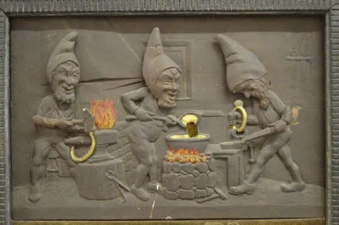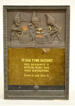 Animated Gnomes Jewelry Store Window Display Einson Makers, New York label on the back; clock works mechanism; phrase about birthstone rings; wood, gesso and cloth; exposed back. Not tested. In as found condition with a little roughness. Not Running. 21 1/4" T x 14 3/4" W x 5 1/2" D