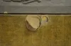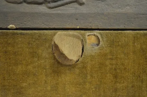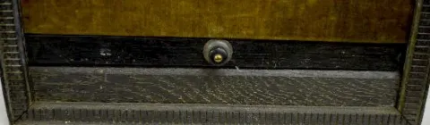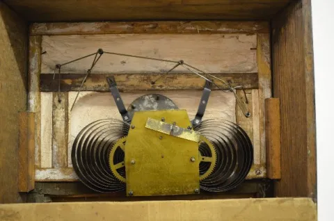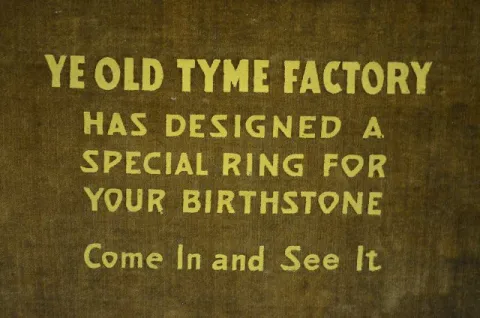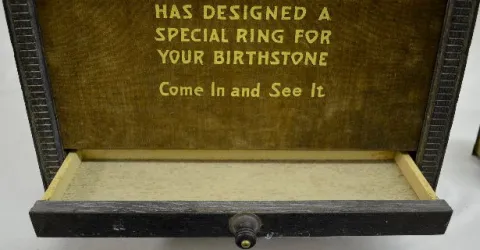 Einson Makers, New York label on the back; clock works mechanism; phrase about birthstone rings; wood, gesso and cloth; exposed back. Not tested. In as found condition with a little roughness. Not Running. 21 1/4" T x 14 3/4" W x 5 1/2" D