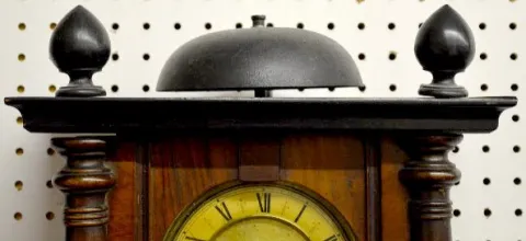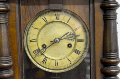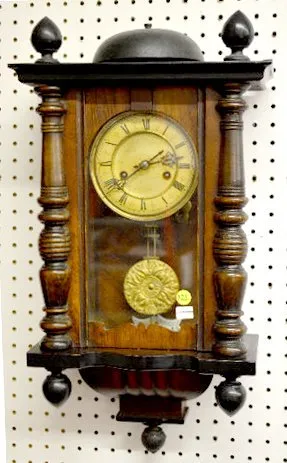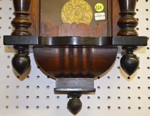 With a T&S movement marked with crossed arrows; a porcelain chapter ring dial; and the pendulum. Not tested. (The wood on the bottom where the finial ...