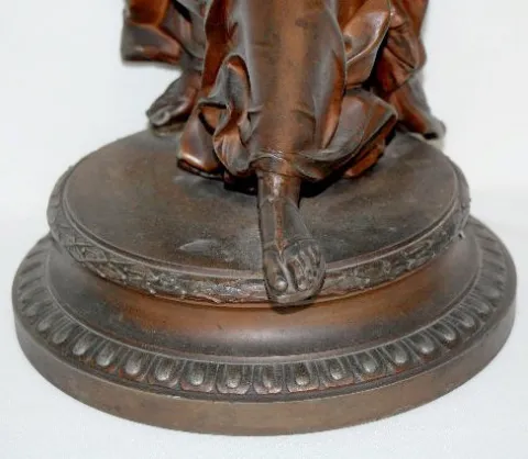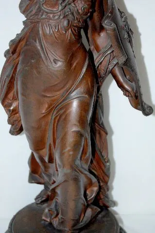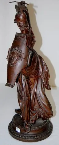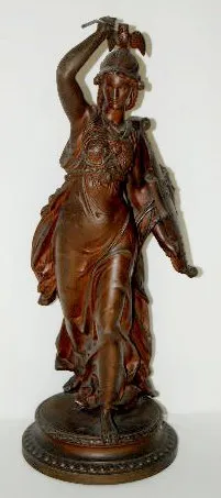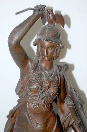White Metal Female Warrior Clock Statue The sandal wearing female warrior has a spear in one hand, an owl with spread wings on her helmet and the head of Medusa on her shield and her breast plate. The warrior is made of heavily cast white metal. (The fold of her gown behind her left foot has been broken off and re-attached. The weld line is visible but does not detract from the overall look.) 20 1/2" Tall