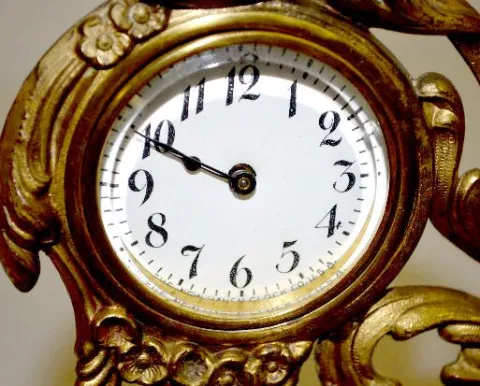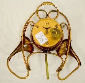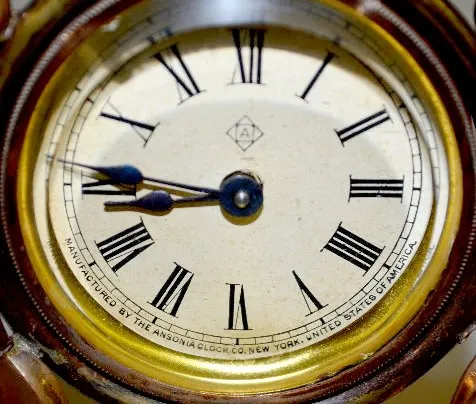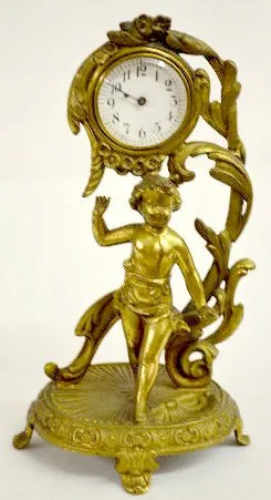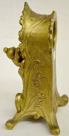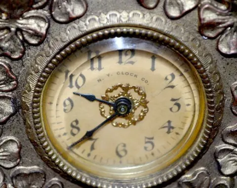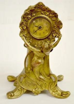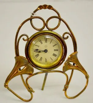 1.) Ansonia Calla Lily Novelty Clock: Free standing with a copper color 2" paper dial. (The clock is not running at this time. The dial has started to...