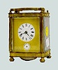 French Bell Strike Carriage Clock With unmarked works and a porcelain dial with hour bit. In a beveled glass case with a visual top and the bell on the bottom. The clock is running at this time. (There is no key with the clock. The hour bit hands are missing.) 4" Tall