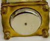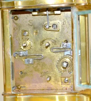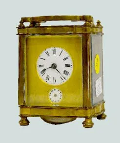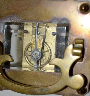 With unmarked works and a porcelain dial with hour bit. In a beveled glass case with a visual top and the bell on the bottom. The clock is running at this time. (There is no key with the clock. The hour bit hands are missing.) 4" Tall