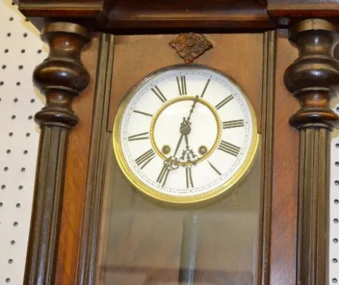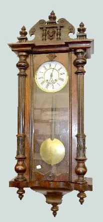 In a carved case with a T&S movement; an unmarked porcelain dial and the pendulum. (The clock is not running at this time. There are no weights with t...
