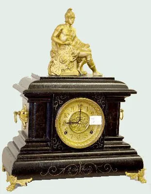 Ingraham Black Mantel Clock w/Statue With an 8 day T&S movement and an ornate gold colored metal dial with raised numerals. The case has metal side ornaments and feet; there is a Roman soldier with a lion head shield attached to the top of the clock. The pendulum is with the clock. The clock is running and gonging at this time. The owner states this clock has been fully serviced. 20 1/2" Tall