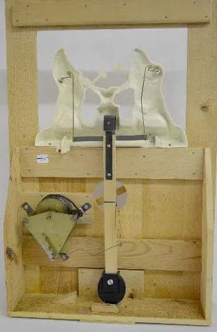 In a wood frame with dwarves hammering on an anvil that reads W.W.W. Guaranteed Rings. Dick Broline was in the process of rebuilding this display. Not tested. 23 1/2" Tall x 16" Wide