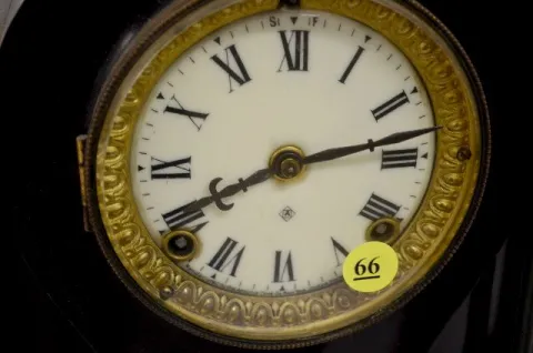 T & S; porcelain dial; enameled iron with ornate trim; signed dial and movement. (Case has a little staining to it.) Not tested....
