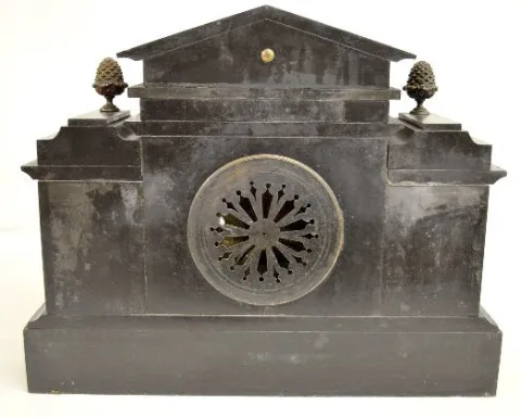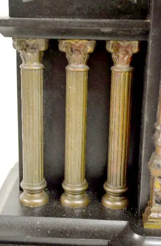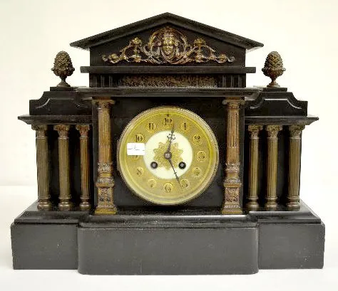 French Black Slate Mantel Clock With a T&S movement marked "Made in Paris" and "G&B 12434"; a lady head ornament with pineapple finials; warrior frieze; four columns on each side and the pendulum. (The clock is not running.) (There is some wear to the numbers. There is no key with the clock.) 13" Tall