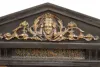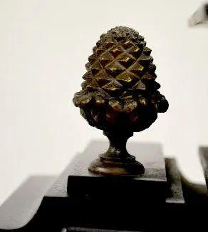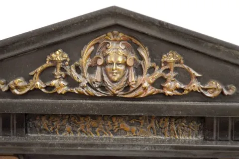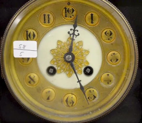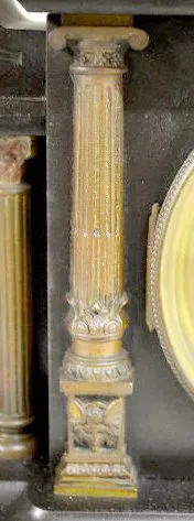 With a T&S movement marked "Made in Paris" and "G&B 12434"; a lady head ornament with pineapple finials; warrior frieze; four columns on each side and the pendulum. (The clock is not running.) (There is some wear to the numbers. There is no key with the clock.) 13" Tall
