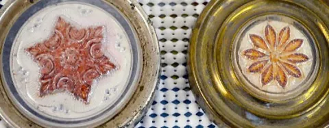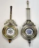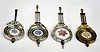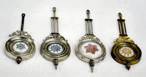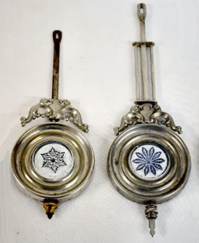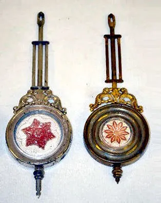 4 Aluminum & Pressed Glass Clock Pendulums They are bull's eye style pendulums and include: one with a 6-point green and white star; one green and white flower; one 6-point pink star on white and one pink and white flower. All are in as found used condition. Longest 8 1/2"