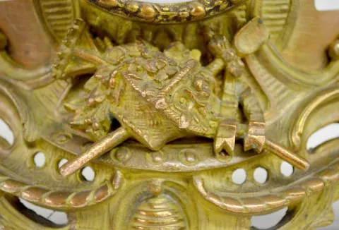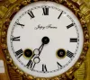 With a T&S movement marked "Vincenti" and "Duplan & Salles par a Paris 070" and a paper and plastic dial marked "Japy Freres". In a bronze filigreed case with a gilt girl statue. The pendulum is with the clock. (The clock is not running at this time but it does chime.) (There is no key with the clock.) 15" Tall