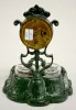 Lux Clock w/Verona Cast Iron Inkwell Stand The clock has a set key wind movement and a marked gold colored paper dial. The glass inkwells are set into a cast iron frame marked "Verona Patented 510". The clock is running at this time. 8 1/4" Tall