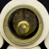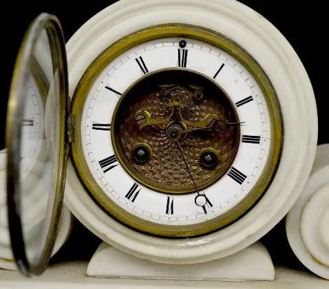 French Marti White Marble Scroll Mantel Clock With a T&S strike visible movement marked "Marti" and "Barrard & Vignon Horlogerie Paris 253"; a porcelain chapter ring dial with a metal center and the pendulum. (The clock is not running at this time.) (The winding arbor is tightly wound. The pendulum does not fit - the top is the incorrect size for the suspension. There is some minor chipping to the case of the clock. There is no key with the clock.) 11 1/2" Tall x 21 1/2" Wide