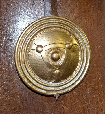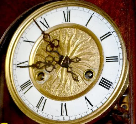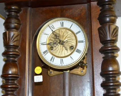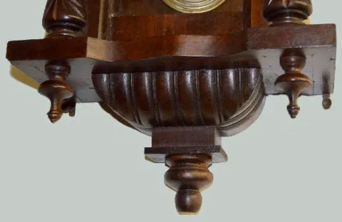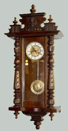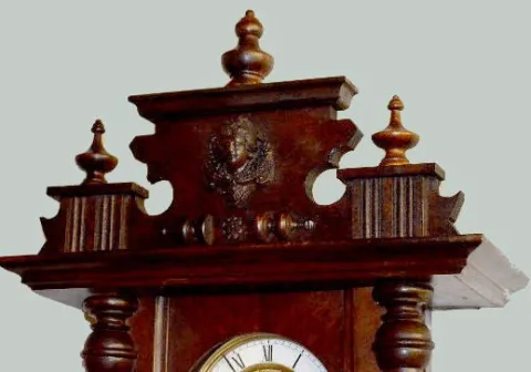 Carved Lady Head RA Wall Clock With an 8 day T&S movement with porcelain chapter ring dial with a sunburst center and a Deco pendulum. The clock is running at this time. (The lower finial needs to be attached.) 37 1/2" Long