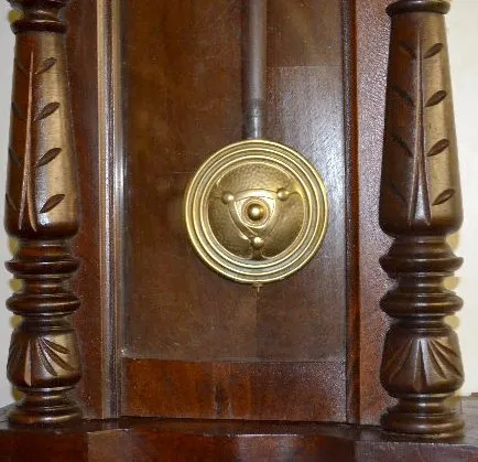 With an 8 day T&S movement with porcelain chapter ring dial with a sunburst center and a Deco pendulum. The clock is running at this time. (The lower finial needs to be attached.) 37 1/2" Long