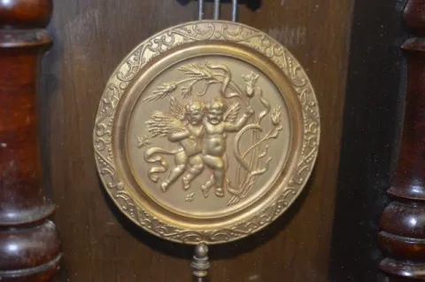 With a T&S movement; a porcelain chapter ring dial with a floral molded center; a double cherub pendulum. In a carved case with a carved crest and sid...